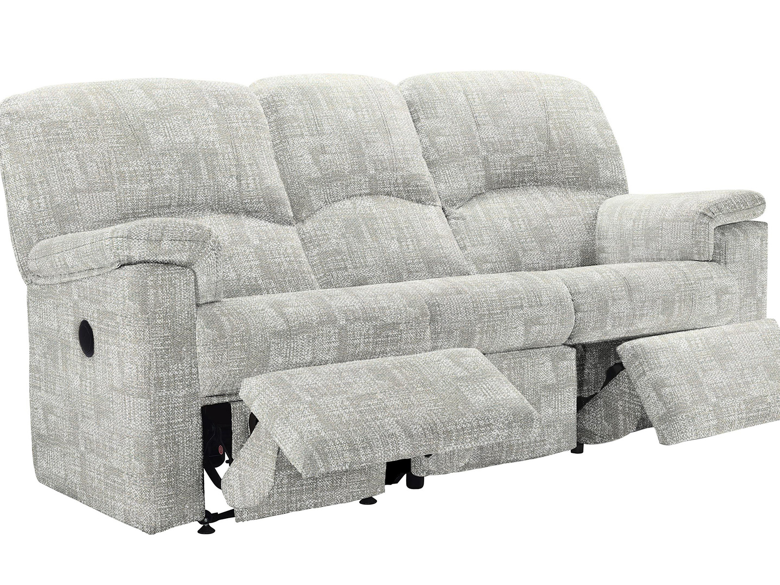 The G Plan Upholstery Chloe Three Seat Double Power Recliner brings power reclining with double action for ultimate relaxation. The rangeâs distinctive high back and bull-nose seat cushions ensure exceptional comfort. Recliner sofas supplied in sections on fixed feet only. Handcrafted in the UK with a 25-year timber frame guarantee. Photos shown in: Capri Mushroom.