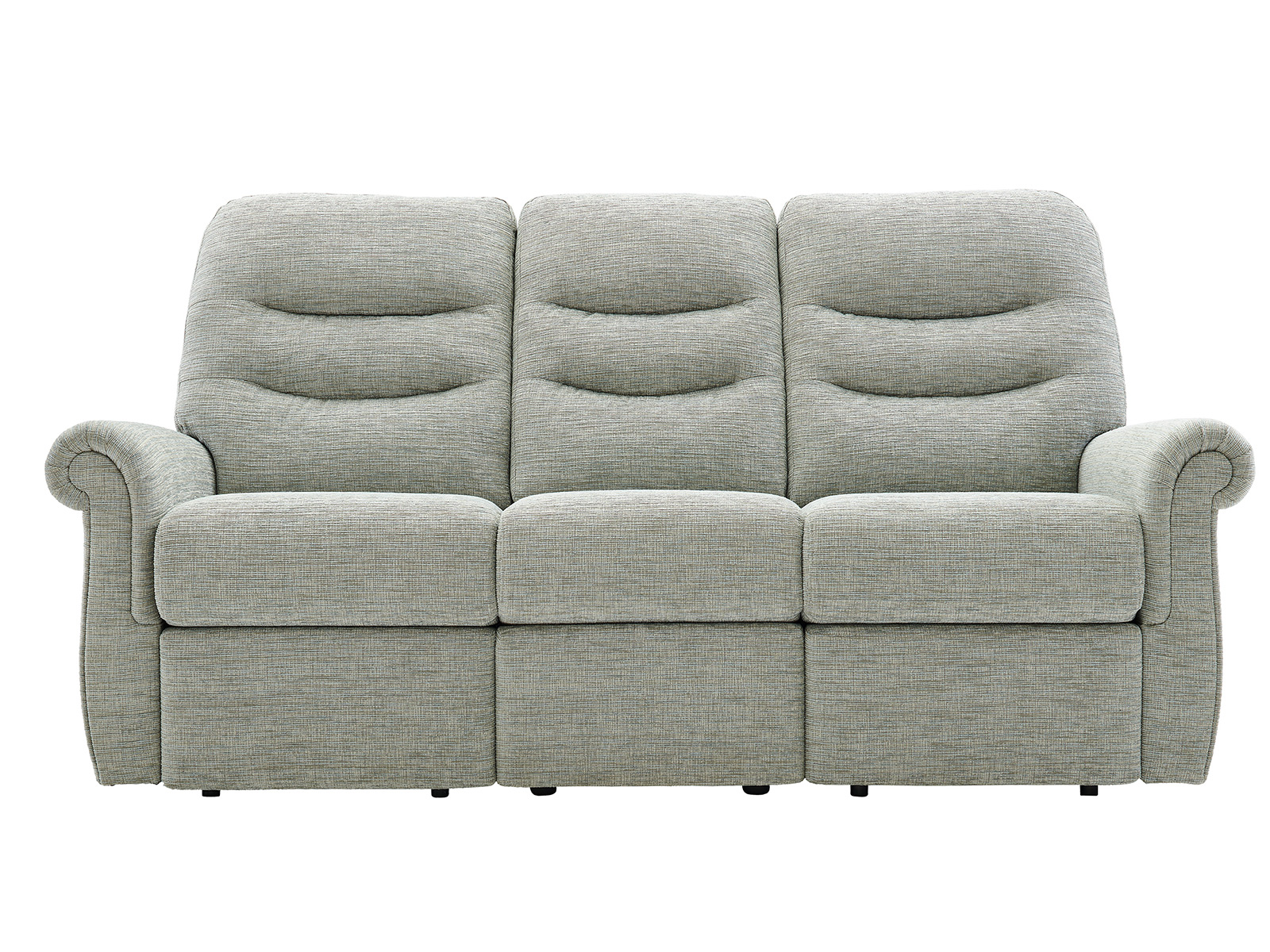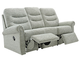 The G Plan Upholstery Holmes 3 Seater Electric Recliner DBL provides double power reclining with the elegant scroll arms and high back. Dimensions: H 1054 mm / 41.5 in, D 1054 mm / 41.5 in, W 914 mm / 36.0 in, Seat Height 914 mm / 36.0 in, Seat Depth 514 mm / 20.3 in, Seat Width 508 mm / 20.0 in, Clearance 1626 mm / 64.0 in. Handcrafted in the UK with a 25-year timber frame and frame construction guarantee.