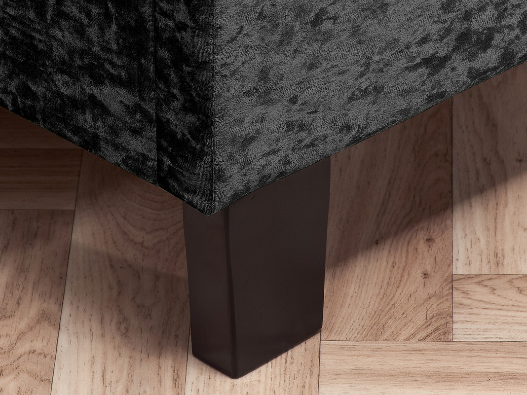 The Berlin frame is upholstered in polyester with complementary dark feet and is available in steel, black crushed velvet and grey polyester.