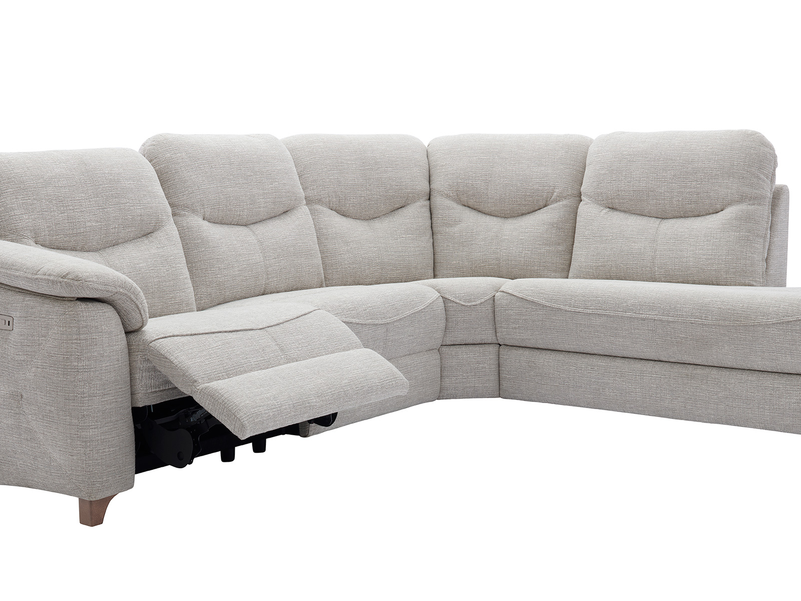 The G Plan Upholstery Jackson 3 seater Corner with Chaise with 1 Single Power Rec RHF with USB features chaise and right-hand-facing power reclining with USB. Handcrafted in the UK with a 25-year timber frame and frame construction guarantee.