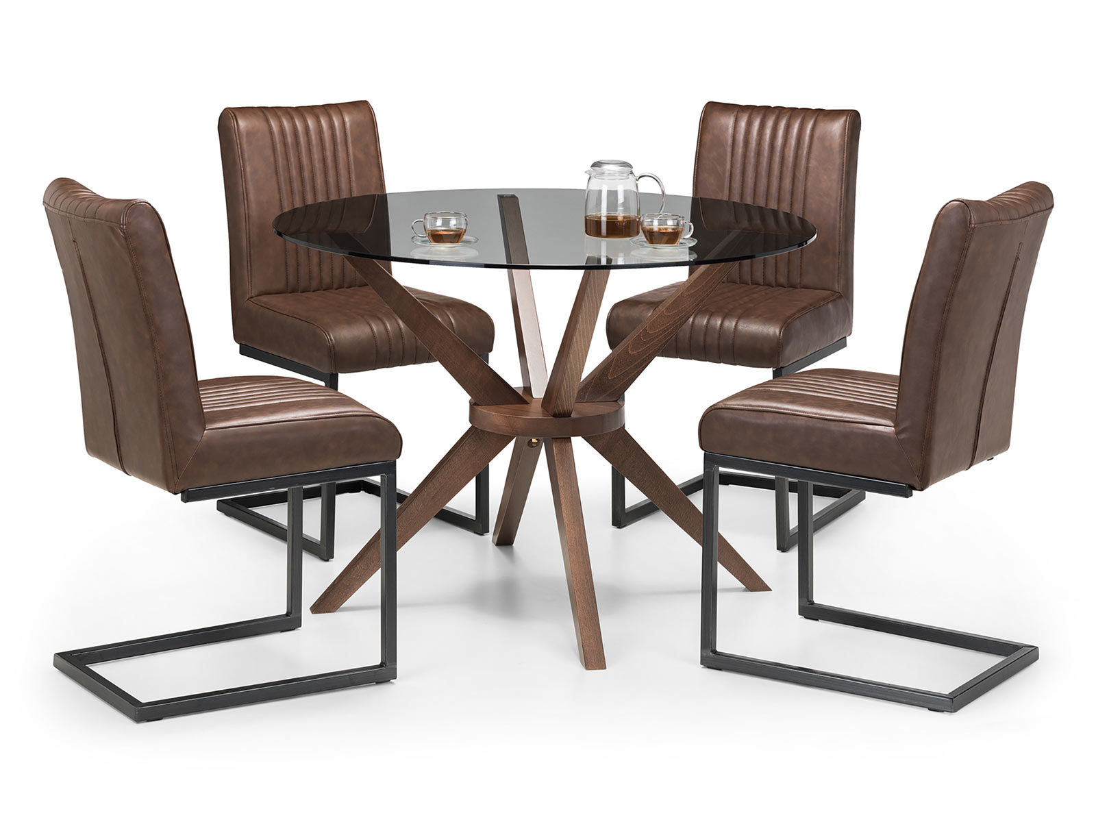 A truly stunning 120cm circular dining table featuring an elegantly styled solid wood base in walnut finish, topped with a substantial tempered glass top to create an exquisite contemporary piece that will take pride of place in any home.